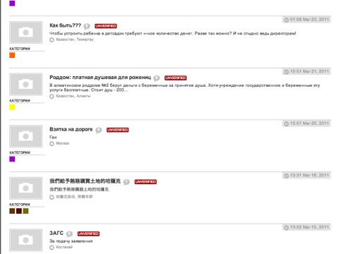 Новый репортер.org. Мониторинг карты взятки. За 10 дней работы проекта «У меня попросили взятку» поступило 18 обращений. На карте появились первые метки — «кровавые пятна» коррупции на карте нашей родины:-) (в данном случае, считай, планеты Земля). Пермь, Москва, Бишкек, Алматы первыми отметились на карте.