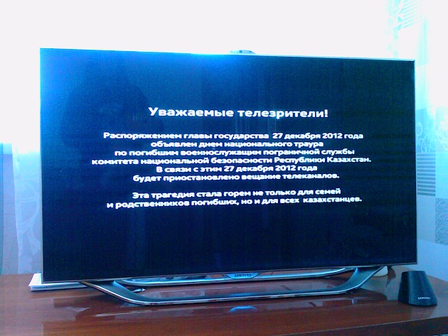 Она сообщала, что в связи с днем национального траура по погибшим (27 человек разбились в военном самолете под Шымкентом вечером 25 декабря) вещание телеканалов будет на один день прекращено.