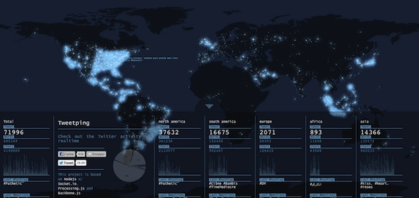 Это совсем простой инструмент, в нем нет никаких настроек, и единственное, что он делает, это показывает Twitter-активность на всей планете в режиме реального времени. На карте видно, как меняется «нагрузка» по континентам, последние тэги, количество твитов и слов в них. Удобный инструмент для тех, кто следит за твиттер-трендами.
