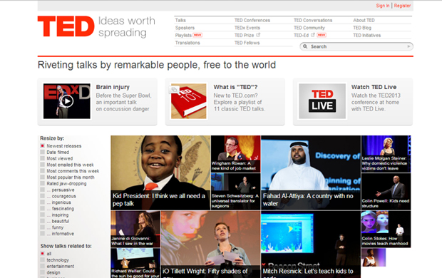Записи с выступлениями самых выдающихся спикеров можно найти на сайте TED.com. В настоящий момент более 1500 избранных лекций с переводами на разные языки доступно на веб-сайте. Все видео выложены с лицензией Creative Commons BY-NC-ND, что разрешает их свободное распространение.