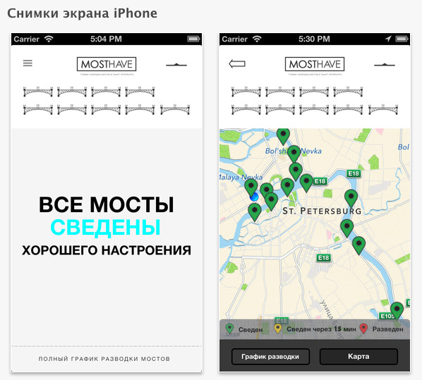 В мае в Санкт-Петербурге появилось мобильное приложение Most Have, показывающее график развода мостов. В комментариях пользователи отмечают, что инфорация отображается согласно официальному графику, но на самом деле, иногда мосты сводят раньше (если закончилась навигация), поэтому данные с веб-камер более актуальны. В городе уже было похожее городское приложение – Bridges HD Lite, уступающее Most Have по качеству дизайна и удобству интерфейса.
