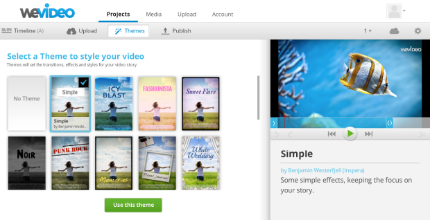Если же вам не хочется самостоятельно заниматься редактированием ролика, вставлять эффекты и переходы, подбирать звуковое сопровождение, то вы можете воспользоваться автоматическим генератором видео с помощью наложения одной из предлагаемых тем. Вам предлагается на выбор множество шаблонов, с помощью которых вы сможете оформить свою работу в стиле ретро фильма, музыкального клипа, романтического видео и так далее. В результате вашего выбора сервис WeVideo самостоятельно наложит необходимые эффекты, разобьет ролик на сцены и вставит переходы, подберет соответствующую музыку, а вам останется только сохранить готовый результат.