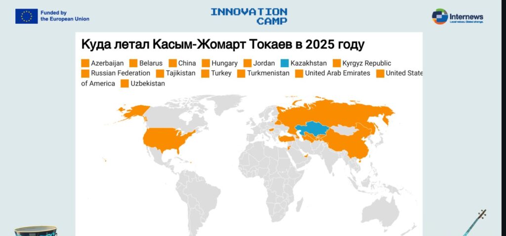 Запрос был простым: собрать все страны, которые президент Казахстана посетил в 2025 году. Такую карту в Datawrapper можно собрать примерно за 15 минут.