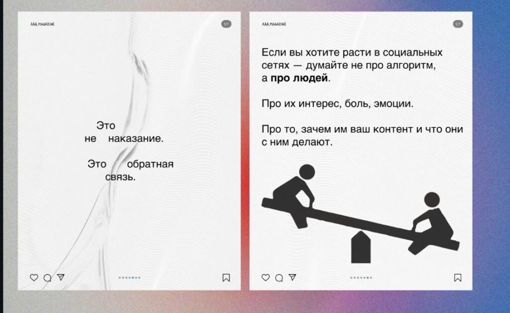 «Это странно звучит, но есть такая вещь — магия энергии текста. Я не знаю, как это работает. Когда вы делаете что-то без души, просто публикуете — оно почему-то и воспринимается так же. А когда вкладываете в свой контент себя, не всегда, но чаще всего это выстреливает. Это из моего опыта, и, скорее всего, у вас тоже бывало: сделаете что-то, как попало — и оно не заходит», — говорит Карыпов.