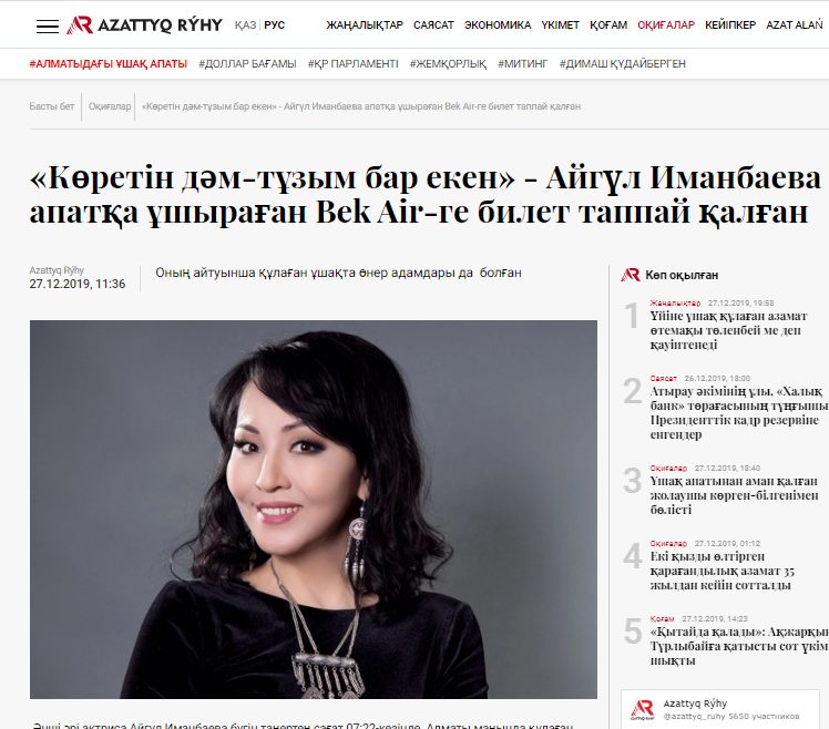 Azattyq ruhy интернет-порталы Алматыдағы ұшақ апаты туралы арнайы айдар ашып, сонда жинақтады. Арасында танымал тұлғалардың аты-жөнін тақырыпқа шығарып, не фотосуретін қойып жаңалық жариялады. Бұған мына екі ақпаратты мысал болады: «Көретін дәм-тұзым бар екен» — Айгүл Иманбаева, «Режиссердің ұлы Алматы түбіндегі ұшақ апатынан аман қалды».