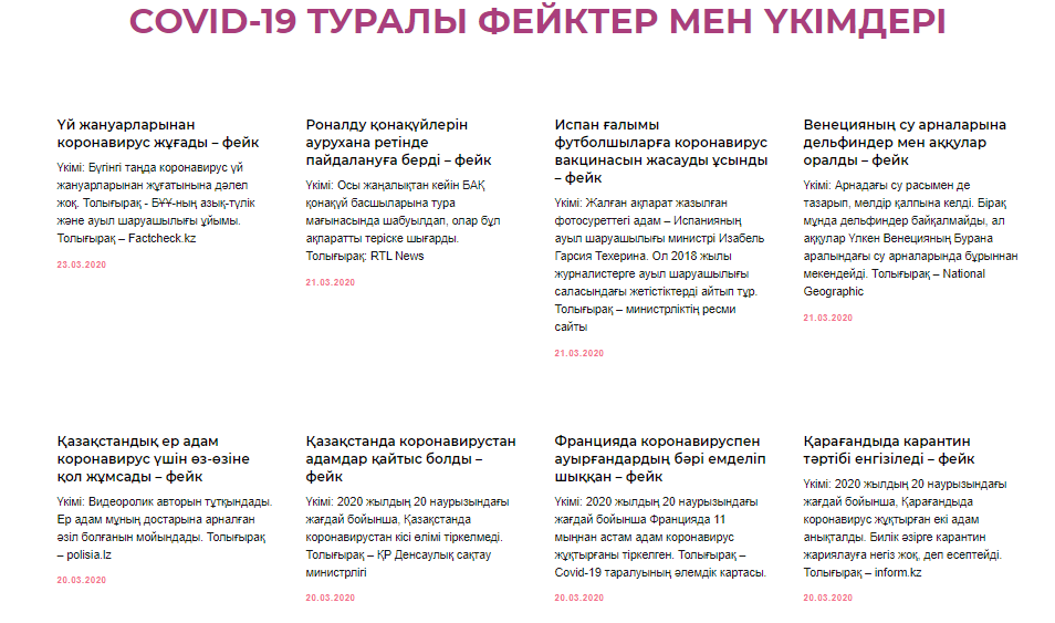 Factcheck.kz, «Жаңа репортер» және «.три.точки. Знай, что смотришь» фактчекинг редакциялары Covid-19 коронавирусы туралы фейктер мен үкімдері жинақталған «Коронавирус, кет, кет, кет» арнайы жобасын дайындады.