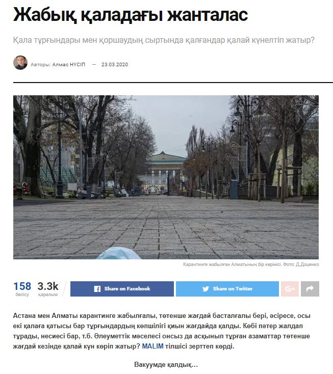 Осы тұрғыдан карантин кезіндегі қарапайым азаматтардың тыныс-тіршілігі туралы Malim.kz интернет сайтындағы мақаланы атап өтуге болады. «Жас Алаш» газетінің бұрынғы командасы ашқан сайттағы мақала карантин жағдайында күнкөрісінен айрылған алматылықтардың жағдайын баяндайды. Қаңырап қалған Алматы көшелерінің суреттері бар. Сұлулық салонында жұмыс істейтін келіншектің жағдайы көпшілік тағдырымен үндес.