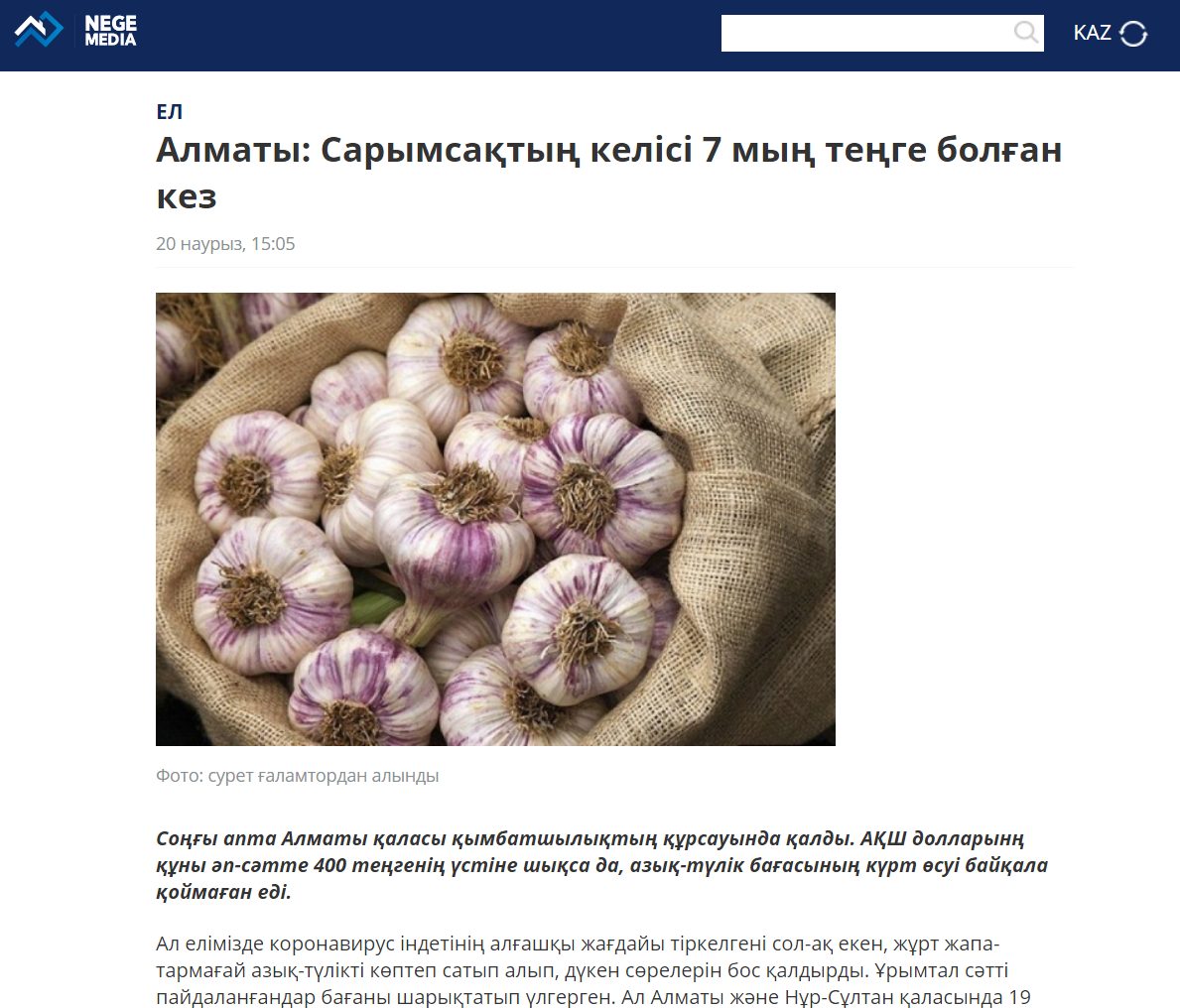 «Сарымсақтың бір келісі — 7 мың теңге» мақаласында азық-түлік бағасының көтерілуіне тоқталады. Әттеген-айы, мақалада сарымсақ қауіпті вирустан қорғайтыны туралы жалған ақпаратты терістемейді.