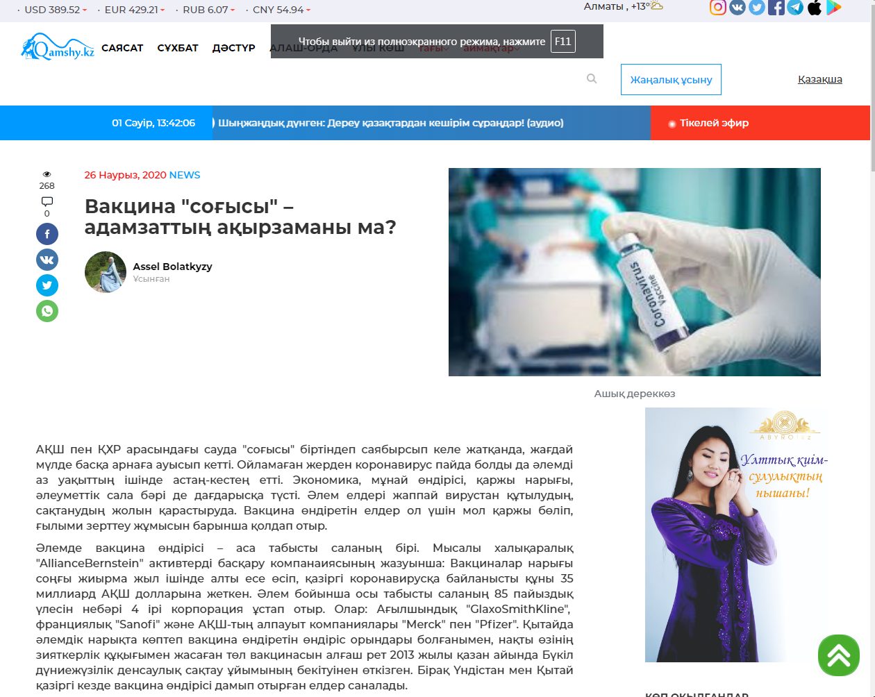— AllianceBernstein мәліметінше, вакцина үшін салынған әрбір бір доллар 44 доллар пайда береді. Вирустардың қайдан шыққанын бір құдай білсін, табиғи түрде пайда бола ма, әлде әдейі қолдан жасалып, таратылып осыдан әлдекімдер пайда табады ма?-дейді автор. Вирус туралы мұндай пікірлер әлемдік БАҚ-та жоққа шығарылса да qamshy.kz сайты сұрақтарына әлі жауап таппағандай.
