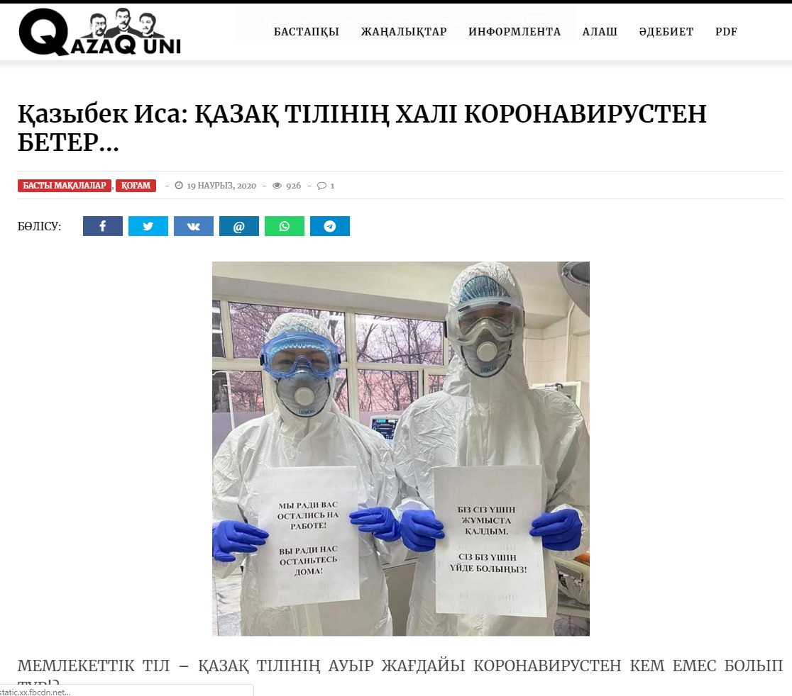 Газет құрылтайшысы Қазыбек Иса: Коронавирусқа байланысты дәрігерлердің «Біз сіз үшін жұмыста қалдық! Сіз біз үшін үйде қалыңыз!» деген сөзі орыс тіліндегі «Мы ради вас остались на работе! Вы ради нас останьтесь дома!» нұсқасынан дұрыс аударылмаған, дұрыс жазылмаған» дей келе, «30 жылда мемлекеттік тілде емес, орыс тілінде қате жазатын жағдайға жетуіміз керек еді» депті. Ол осылайша мемлекеттік тілге «жедел жәрдем» шақыру керек екенін» айтып, «коронавирустен гөрі, қазақ тілінің халі мүшкіл» деп күйінеді.