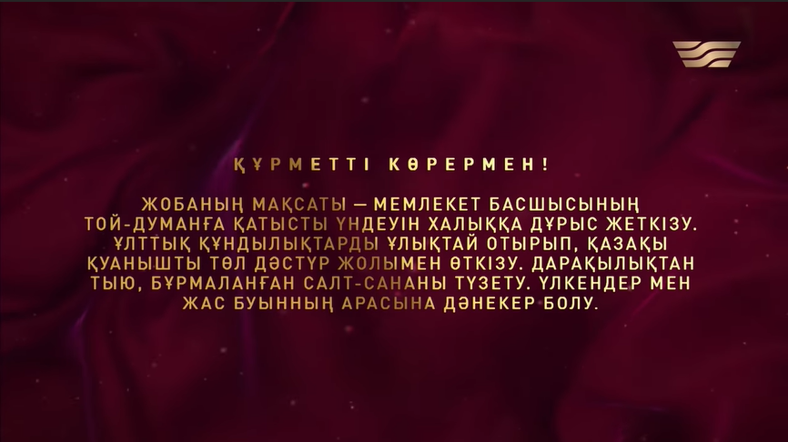 Құрметті көрермен! Жобаның мақсаты — Мемлекет басшысының той-думанға қатысты үндеуін халыққа дұрыс жеткізу. Ұлттық құндылықтарды ұлықтай отырып, қазақы қуанышты төл дәстүр жолымен өткізу. Дарақылықтан тыю, бұрмаланған салт-сананы түзету. Үлкендер мен жас буынның арасына дәнекер болу»