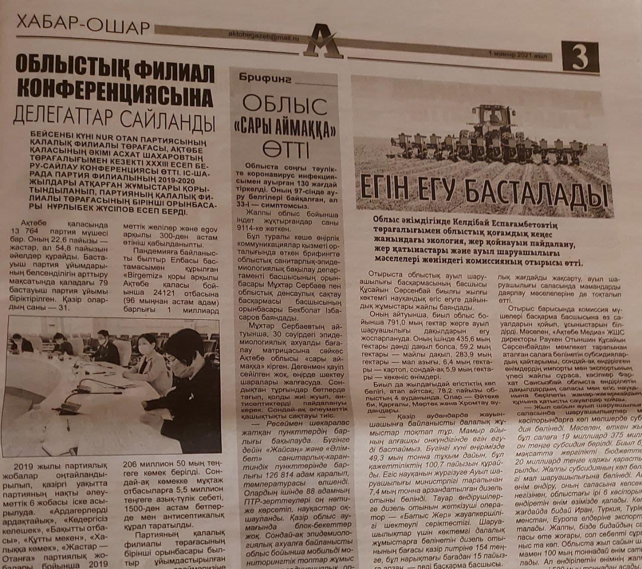 «Бейсенбі күні Nur Otan партиясының қалалық филиалы төрағасы, Ақтөбе қаласының әкімі Асхат Шахаровтың төрағалығымен кезекті ХХХІІІ есеп беру-сайлау конференциясы өтті. Іс-шарада партия филиалының 2019-2020 жылдары атқарған жұмыстары қорытындыланып, партияның қалалық филиалы төрағасының бірінші орынбасары Нұрлыбек Жүсіпов есеп берді» (1 мамыр, №48).