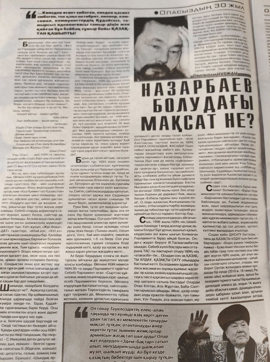2021 жылы 1 желтоқсанда басылымда «Елбасыны» кетірмей, ештеңе өзгермейді!» деген мақала жарияланды. Бұл – қарашаның аяғында Алматыда өткен Халық құрылтайында қоғам қайраткері Рысбек Сәрсенбайұлы жасаған «Назарбаевтық жүйені күресінге лақтырайық!» деп аталған баяндаманың ықшам нұсқасы. Автор азаматтарды ел президенті мен биліктің басқа да өкілдеріне бірнеше талап қоюға үндейді. Олар – Конституцияны және демократия принциптеріне сай келмейтін «Қазақстан Республикасындағы сайлау туралы», «Саяси партиялар туралы», «Қазақстан Республикасында бейбіт жиындарды ұйымдастыру мен өткізу туралы», «Қазақстан Республикасының тұңғыш президенті – елбасы туралы» деп аталатын заңдарды өзгерту, үкіметті таратып, оның орнына халық сенім білдірген мемлекеттік қызметшілерді әкелу. Осының ішінде баяндамашы тұңғыш президентке айрықша саяси-құқықтық мәртебе беретін заңды, ондағы «Қазақстан халқының бірлігін, Конституцияны, адамның және азаматтың құқықтары мен бостандықтарын қорғауды қамтамасыз еткен елбасы» деген анықтаманы қатаң сынайды.